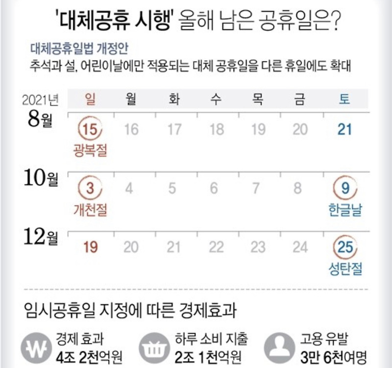 / 대체공휴일 - 광복절, 개천절, 한글날, 성탄절 대체공휴일 되나? : 어떻게 생각 하십니까 대체공휴일 확대 찬반 의견 갈려.여야.